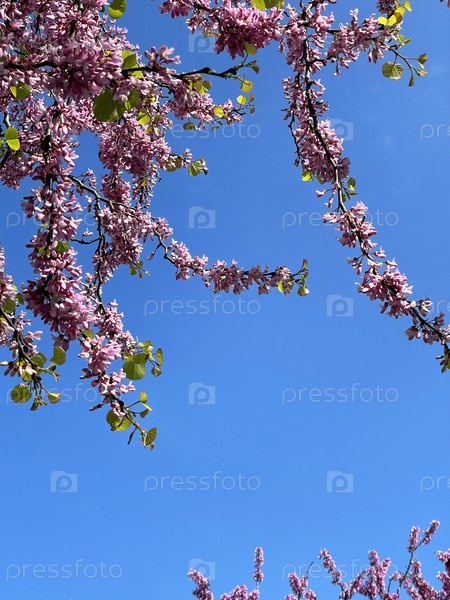 Ветка розового цветущего дерева на фоне голубого неба