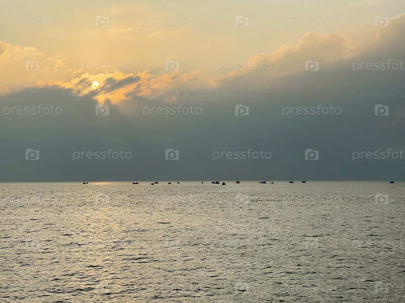 Красивый закат на море, солнце садится за большое облако, лежащее на воде