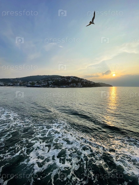 Чайка пролетает над Принцевыми островами. Вид с туристического катера, Турция