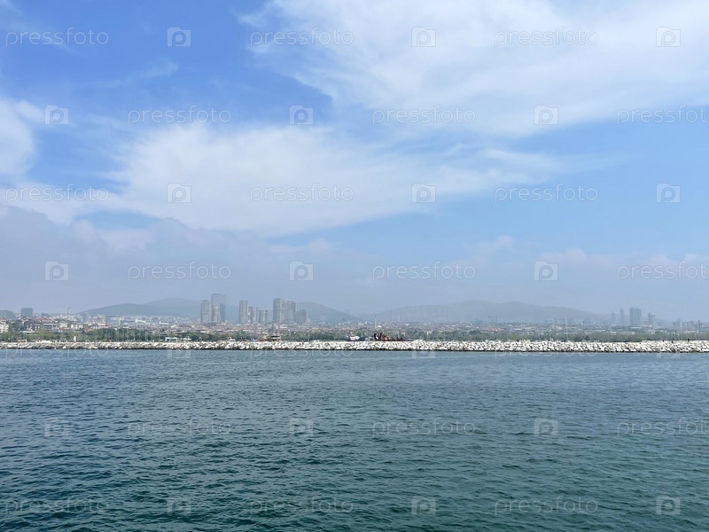 Вид на европейскую часть Стамбула через пролив Босфор в пасмурный весенний день