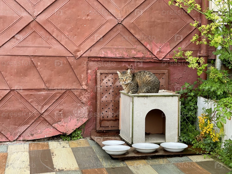 Уличный кот сидит в своем доме с пластинами в гриве в Стамбуле, Турция