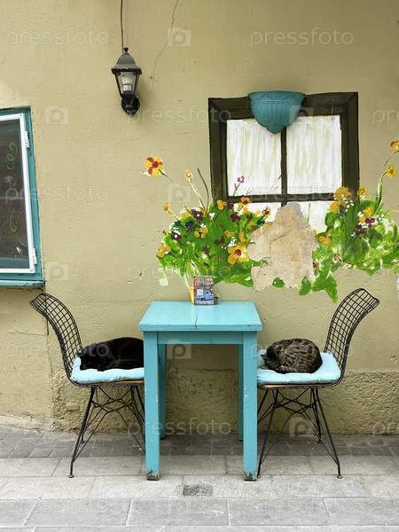 Две кошки лежат на стульях за столиком уличного кафе в азиатской части Стамбула, Турция