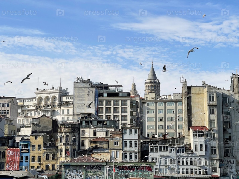 17 апреля 2023 года - Стамбул, Турция: Вид на европейскую часть Стамбула, Галатскую башню, окруженную летающими чайками