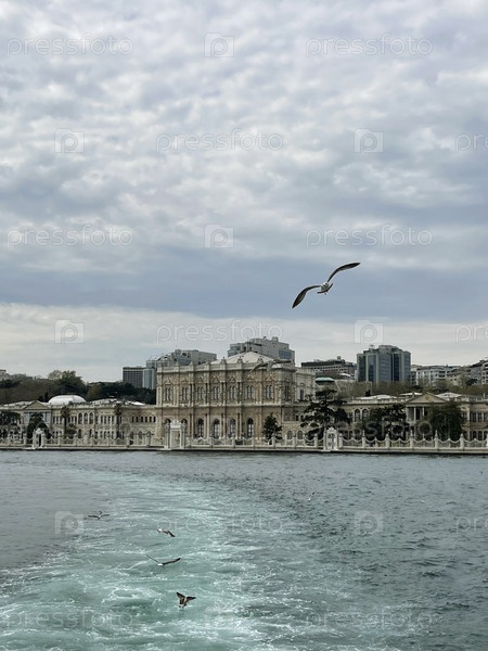 17 апреля 2023 года - Стамбул, Турция: Чайка летит возле дворца Долмабахче в весенний день