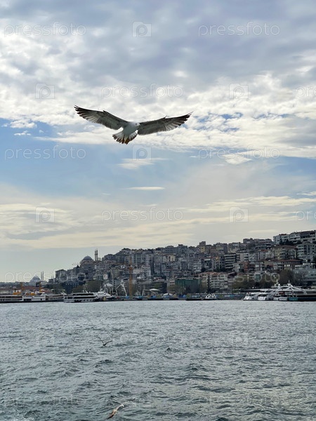 Чайка пролетает над Босфором на фоне Стамбула в пасмурный день, Турция
