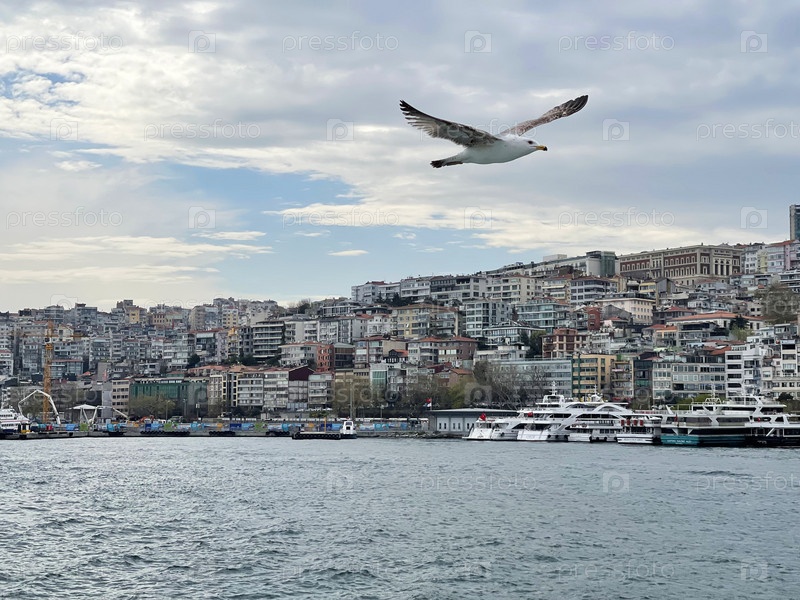Чайка пролетает над Босфором на фоне Стамбула в пасмурный день, Турция