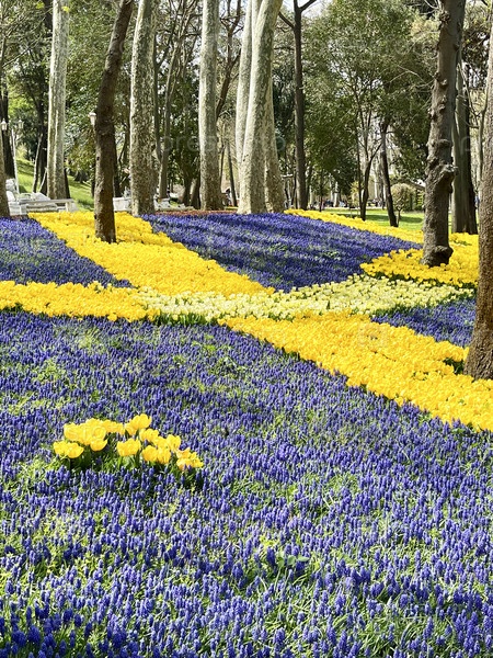 Весенние желтые тюльпаны и гиацинты в парке Гюльхане, Стамбул