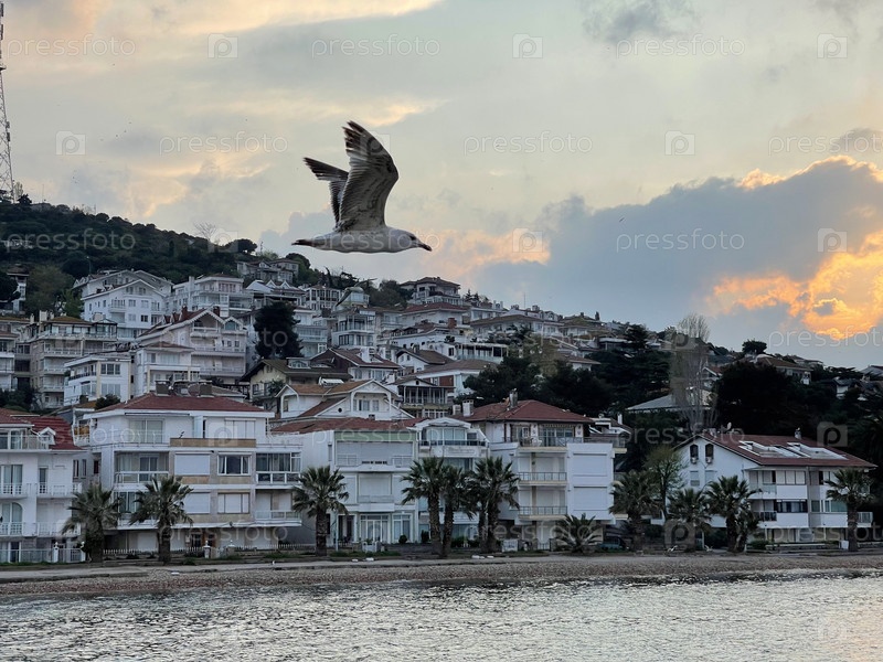 Чайка летит возле Принцевых островов на закате, Турция