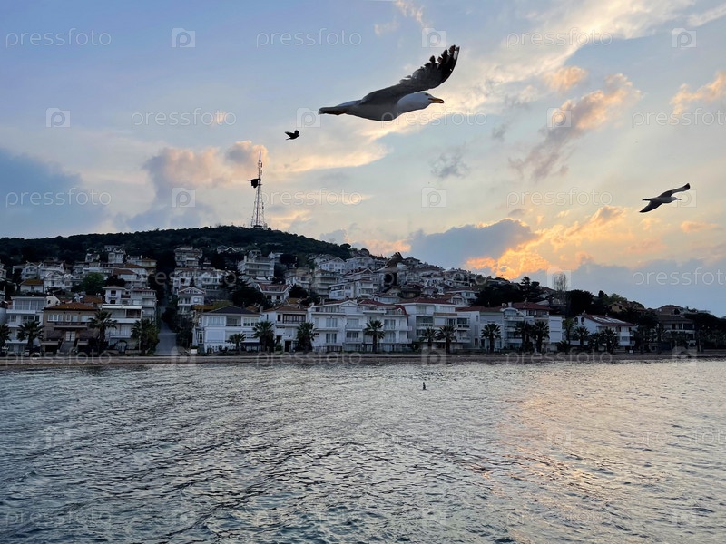 Чайка летит возле Принцевых островов на закате, Стамбул, Турция
