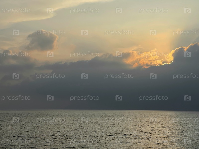 Красивый закат на море, солнце садится за большое облако, лежащее на воде. Рыбаки на лодках вдалеке