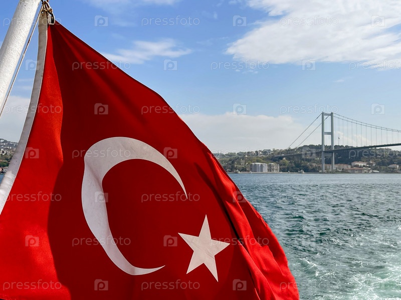 Турецкий флаг развевается на ветру на фоне Стамбула и моста Золотой Рог, Турция