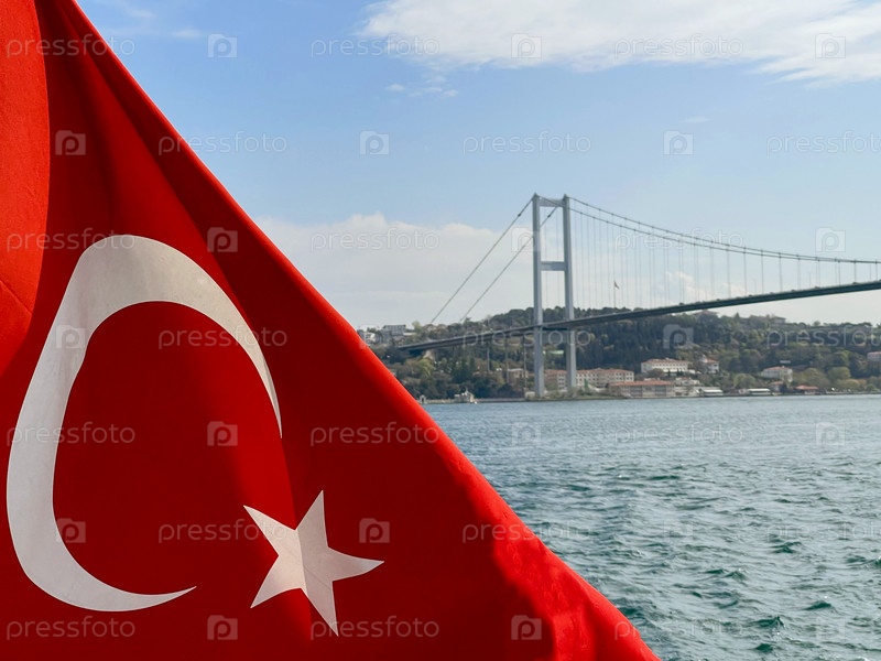 Турецкий флаг развевается на ветру против Стамбула и моста Золотой Рог на заднем плане, Турция
