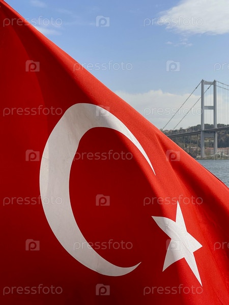 Турецкий флаг развевается на ветру на фоне Стамбула и моста Золотой Рог, Турция