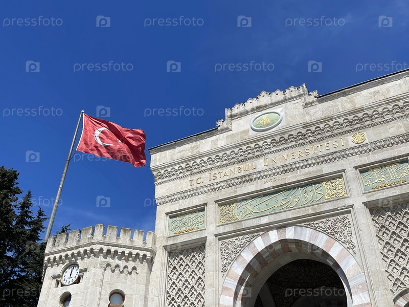 14 апреля 2023 г. - Стамбул, Турция: Стамбульский университет, главный вход с национальными флагами