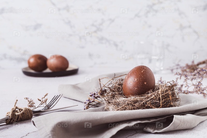 Счастливой Пасхи домашнее яйцо естественного цвета в гнезде на салфетке на столе