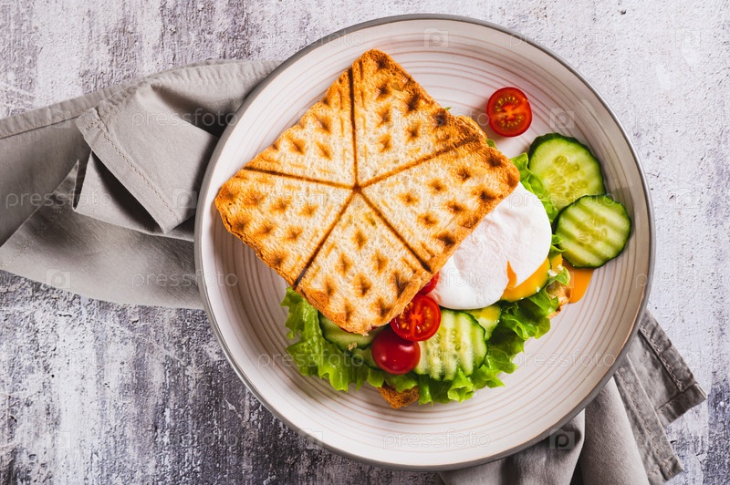 Крупным планом сэндвич с вафельным хлебом, яйцом-пашот и овощами на тарелке сверху