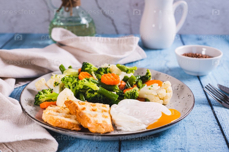 Смесь вареных овощей, яйца-пашот и вафельных тостов на тарелке на столе