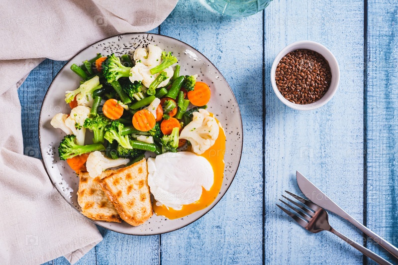 Смесь вареных овощей, яйца-пашот и вафельных тостов на тарелке на столе