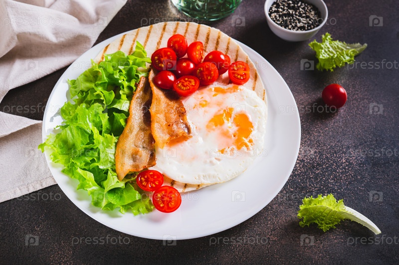 Жареные тако с яйцом, жареным беконом, овощами и зеленью на тарелке на столе