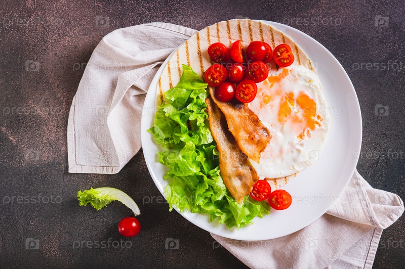 Крупный план тако с жареным яйцом, беконом, помидорами и салатом на тарелке на столе