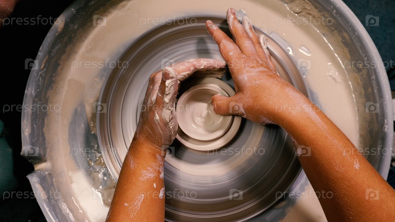 Женские руки, испачканные глиной, формируют из глины заготовку чашки. Вид сверху. Работа на гончарном круге в мастерской. Крупный план. Понятие ручного труда, искусства и ремесла