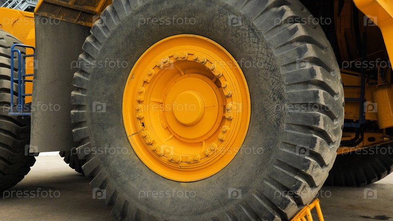 Крупный план большого автомобильного колеса. Шины самосвала. Огромное колесо на желтом грузовике