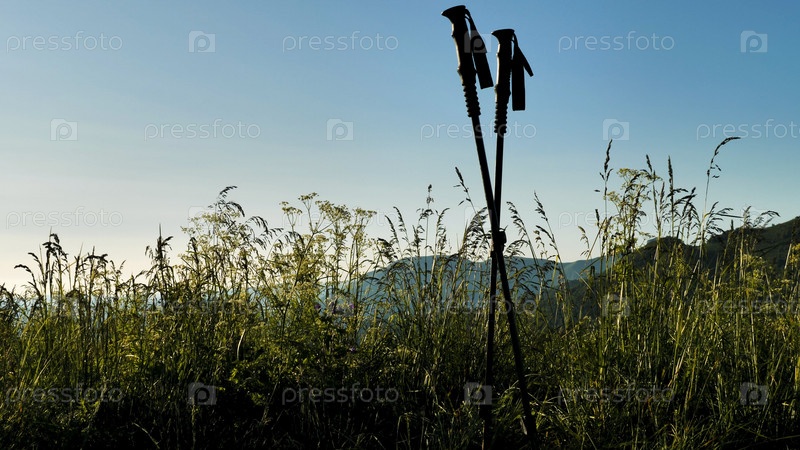 Две треккинговые палки воткнуты в землю на фоне голубого неба и зеленой травы. Поход в горы. Летний активный отдых