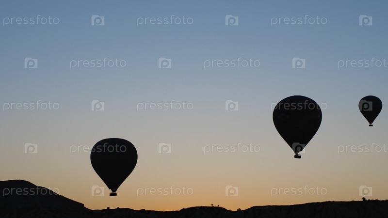 Силуэты воздушных шаров над горами в небе на рассвете. Кинематографическое изображение полета на воздушном шаре