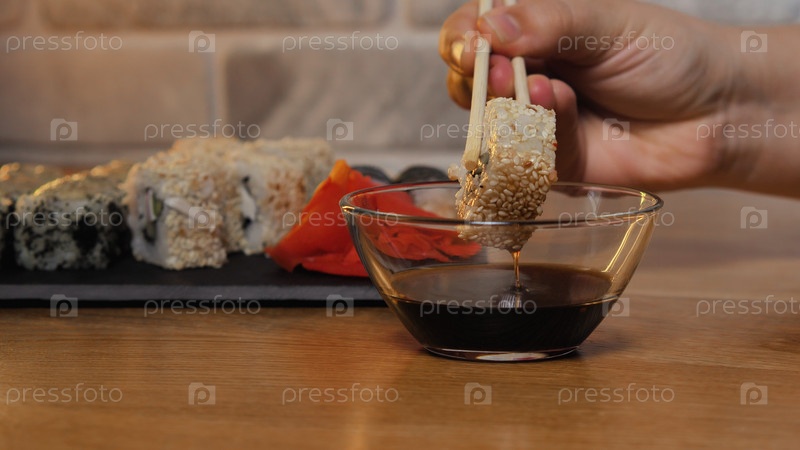 Крупный план: японский рулет, сжимаемый палочками для еды и обмакиваемый в соевый соус. Суши японская еда в ресторане. Белый рулет с огурцом и кунжутом