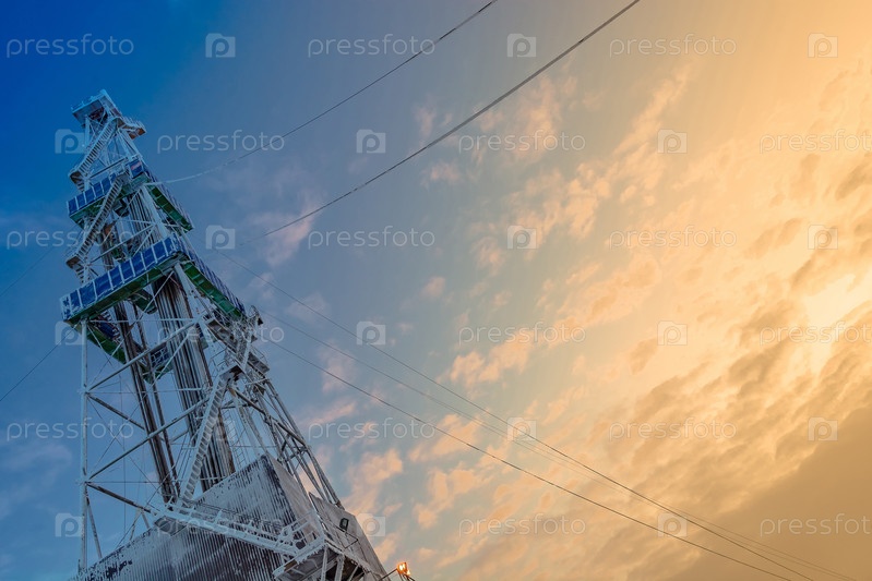 Зимний полярный день в Арктике. Бурение скважины на северном нефтегазовом месторождении. Низкое солнце. Красивое освещение. Намеренный наклон горизонта