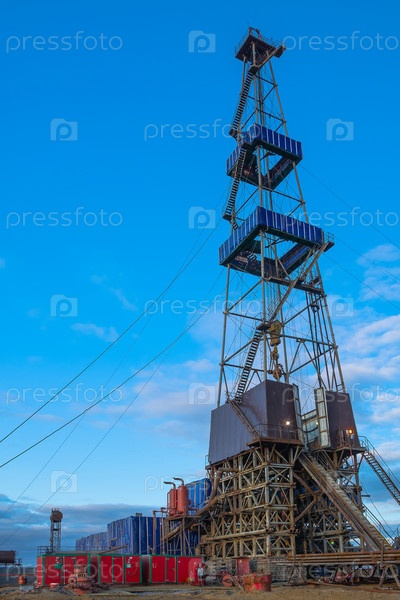 Буровая установка с башней-башней. Внизу находится буровое оборудование. На северном месторождении для добычи нефти и газа бурят глубокую скважину. Летний день. Голубое облачное небо