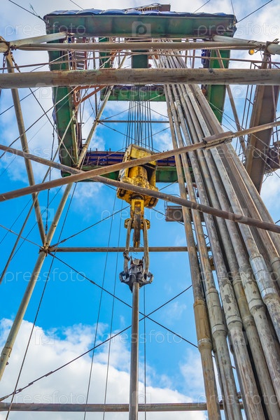 Расположение оборудования внутри нефтегазовой буровой установки. Бурильные трубы стоят вертикально. Подъемная система. Вид снизу вверх. Ведутся работы по подъему бурильных труб из скважины