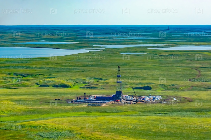 Буровая установка и оборудование на нефтяном месторождении в северной тундре. Вид сверху с вертолета. Зеленая летняя тундра с озерами за Полярным кругом