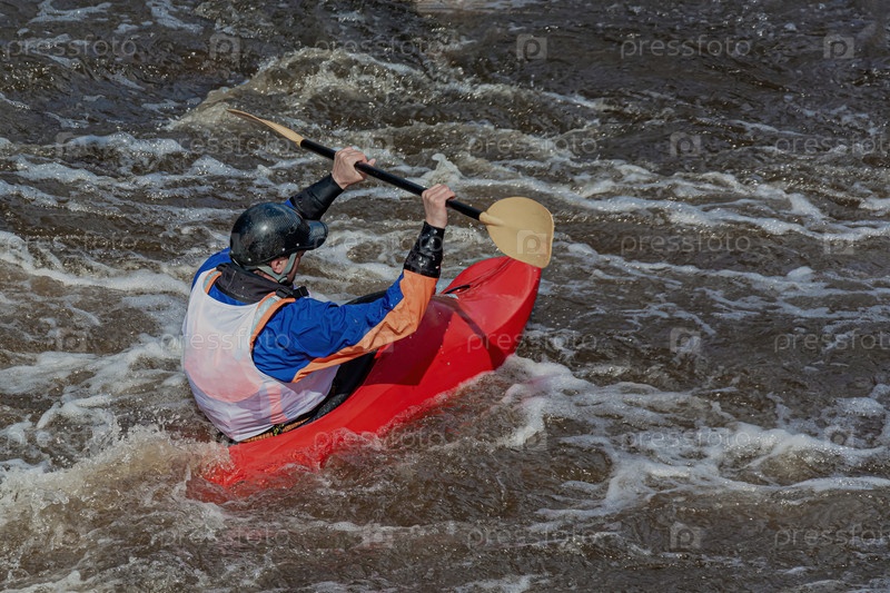 Серия изображений. Спортсмены на байдарках и байдарках покоряют бурные воды реки. Одет в водонепроницаемую одежду и шлемы. В руках они держат весло. Размытость