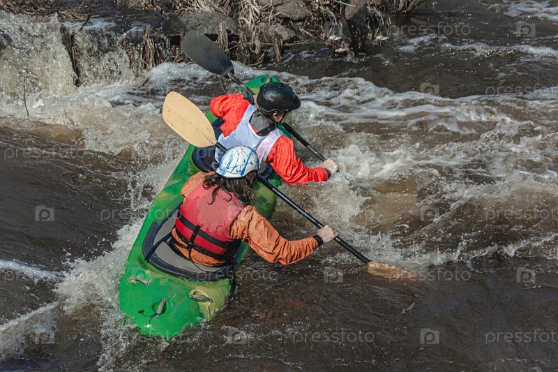 Серия изображений. Спортсмены на байдарках и байдарках покоряют бурные воды реки. Одет в водонепроницаемую одежду и шлемы. В руках они держат весло. Размытость