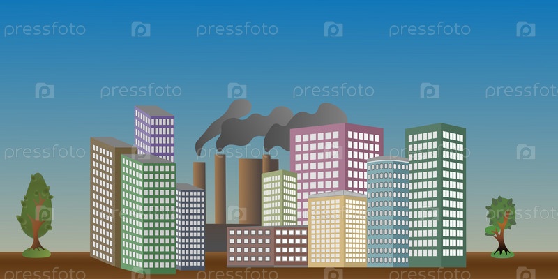 Городские здания на фоне неба. Жилые дома, действующий завод, деревья