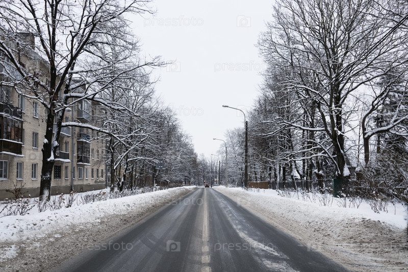 Середина пустой городской проезжей части, заснеженная зимняя улица, деревья и дома по бокам