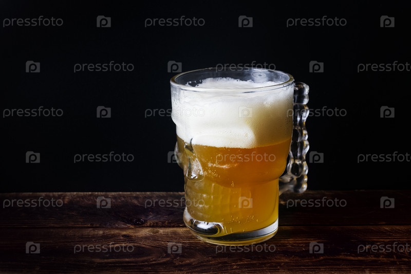 Пивная кружка в виде черепа с пенным пивом на деревянном столе на черном фоне