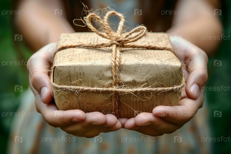 Крупный план женских рук, держащих подарок, завернутый в бежевую бумагу, простота и подлинность