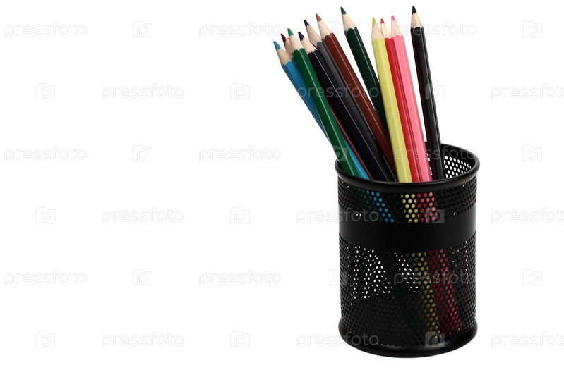 Цветные карандаши в черной подставке на белом фоне