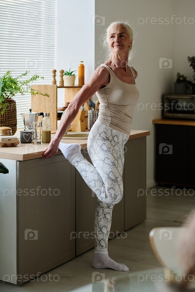 Активная пожилая женщина, занимающаяся спортом дома