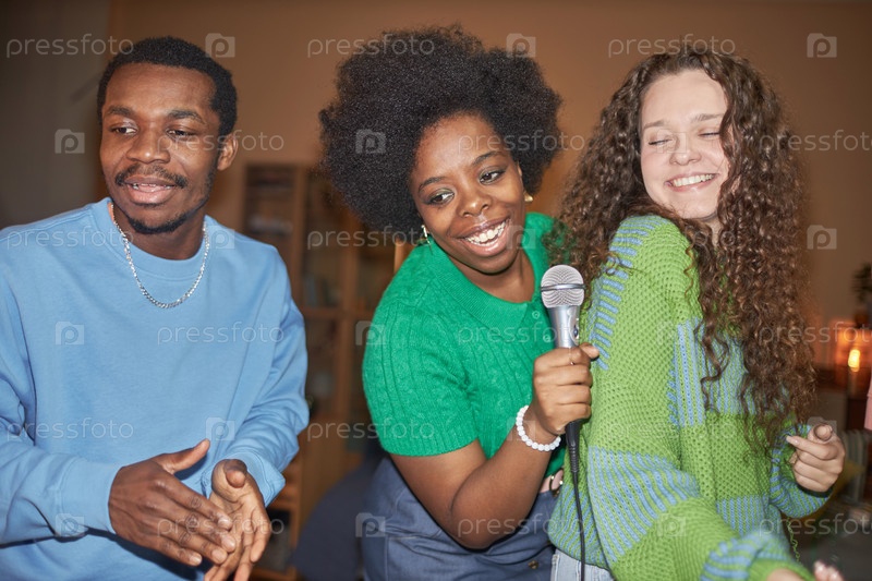 Люди наслаждаются караоке во время домашней вечеринки