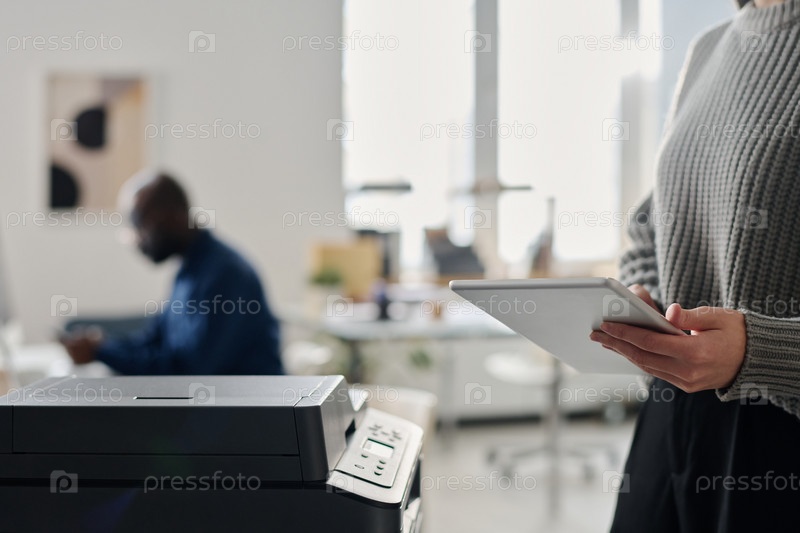 Непризнанная женщина использует цифровой планшет и принтер в офисе