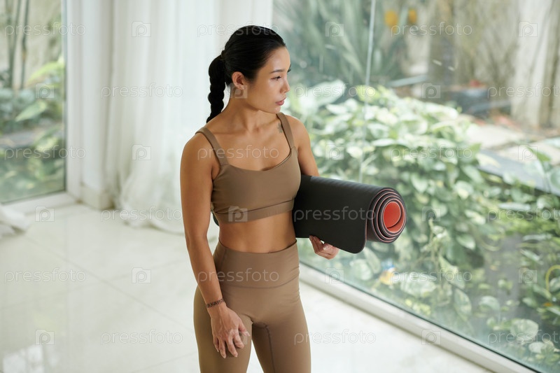 Молодая женщина, держащая йога-матку Fit