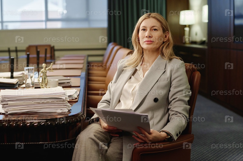 Женщина-адвокат, позирующая на своем рабочем месте с профессиональными документами