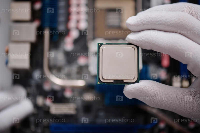 Перчатковая рука технического специалиста, тщательно удерживающего процессор