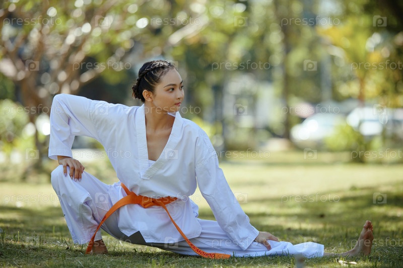 Спортсмен Таэквондо тренируется на свежем воздухе