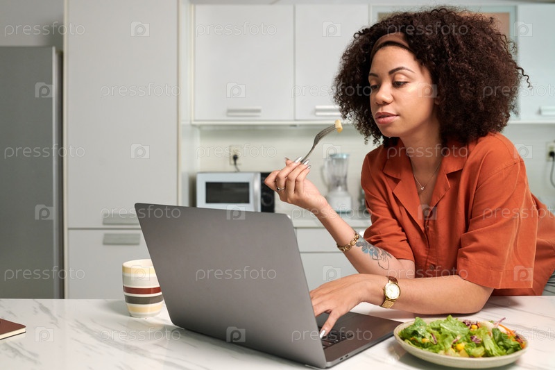 Женщина ест обед и работает над презентацией