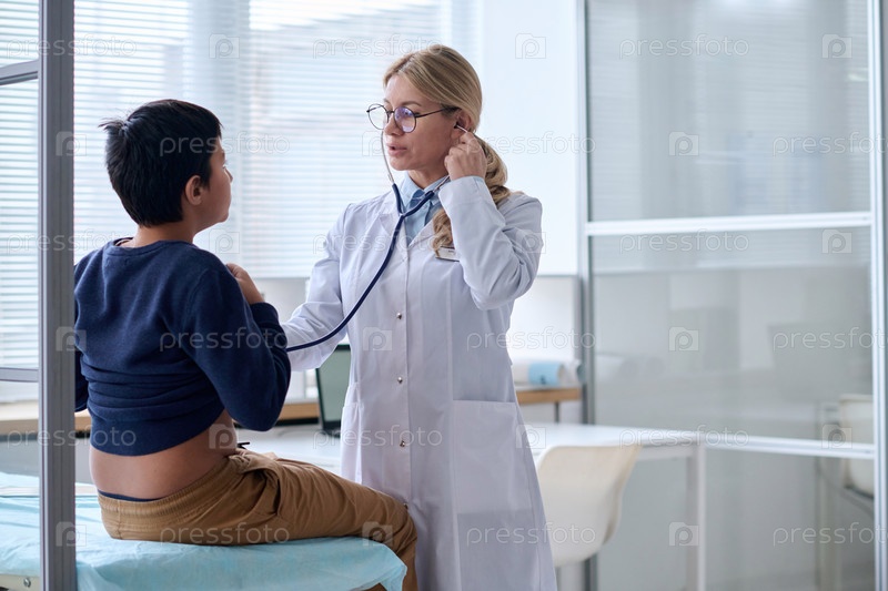 Педиатр-женщина, осматривающая ребенка