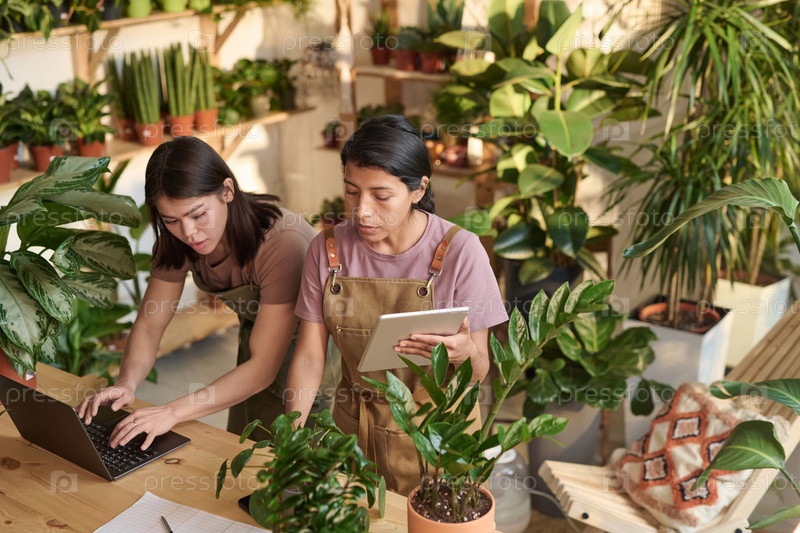 Женские продавцы растений занимаются электронной коммерцией на своем рабочем месте